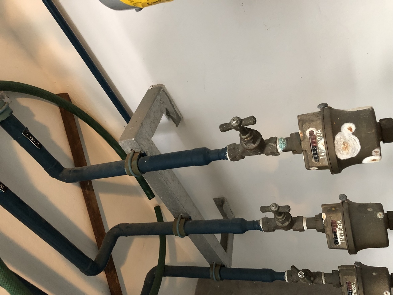 - 各ユニットへの供給は、リフトロビー等自宅の外の廊下に水、電気、ガスなどの供給パイプとメーターが設置されているところがありますのでそこをチェックします。廊下にいくつかドアがあり、そのドアの上に”Water" "Electricity" "Gas"等の表示があり、そのドアを開けるとパイプやメータが並んでいます。通常メーターの所にユニット番号等が書いてありますので、そのメーターにつながっている配管が自宅への供給パイプということになります。そのパイプにバルブがついているところがありますので、それを回すとユニットへの供給が開閉されることになります。多くの場合はセキュリティー上このドアに鍵がかかって、開けられないと思います。その場合は、セキュリティーに言へば開けてもらえます。