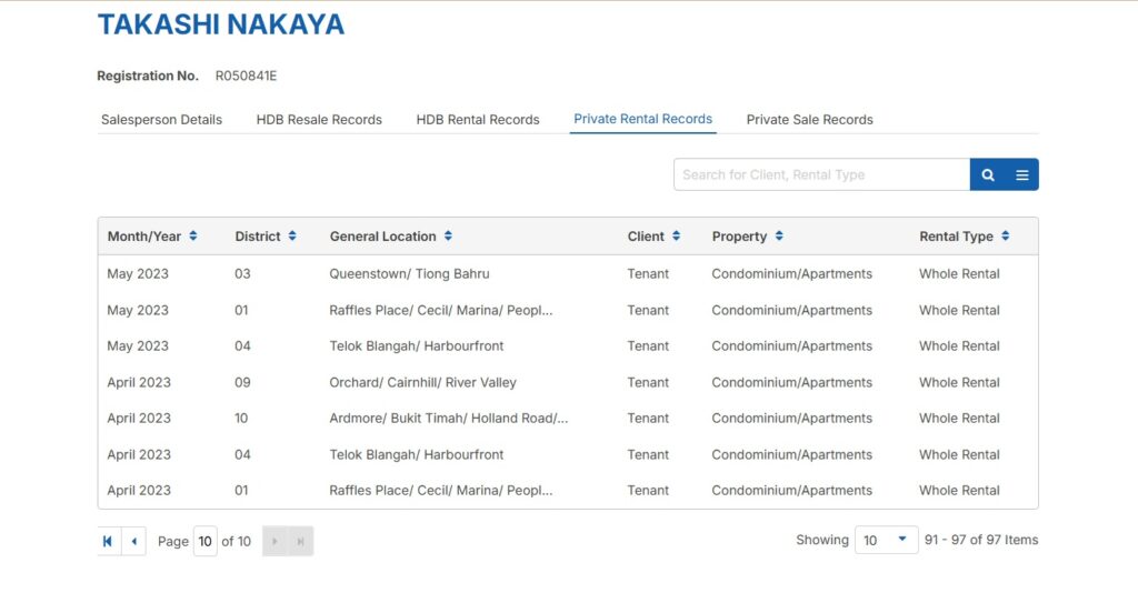 また最近は各エージェントの取引履歴も分かるようになりました。住宅の賃貸ケースを豊富にやっているエージェントかも確認できます。参考までに私のCEA Public Registerページを開き、Private Rental Recordsタブを開くと、取引数97で件でClient欄を確認するとTenant(テナント)が94件、Landlord (家主)が3件とわかります。このようにエージェントが家主かテナント側かどちらの担当が多いのかもわかります。
